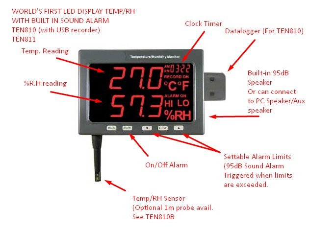 - Complete environmental monitor and alarm - Wall-Mounted LED type, easy reading - Alarm set for Hi and Low limit-Temperature and Humidity - LED displays real time data